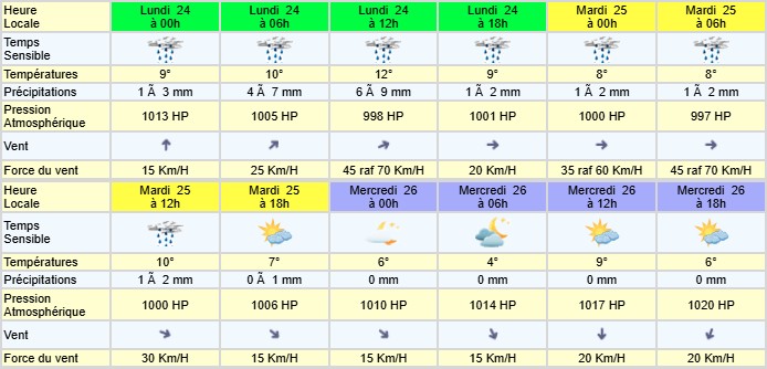 Gelée, ciel dégagé et belle journée, 2°C/8°C. Demain, passage pluvieux en matinée suivi d’averses puis d’éclaircies l’après-midi, 6°C/9°C. Jeudi, gelée ciel à variable et quelques éclaircies, -1°C/6°C. Vendredi, froid, gelée et ensoleillé, -2°C/7°C. Samedi, pluie jusqu’en milieu d’après-midi, suivi et d’averses éparses, 4°C/10°C. Dimanche, ciel variable à rares ondées, 4°C/11°C. Lundi, pluvieux et venteux, 10°C/12°C. Mardi, pluie et vents en rafales, 8°C/10°C. Mercredi variable, 4°C/9°C.