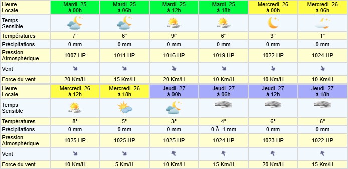 Brumeux ciel variable suivi de belles éclaircies, 6°C/9°C. Demain, gelée à brumes éparses et ensoleillé, 1°C/8°C. Jeudi, nuageux pour la journée, 4°C/6°C. Vendredi, nuageux à variable ciel voilé, 8°C/13°C. Samedi, variable avec pluie l’après-midi, 7°C/12°C. Dimanche, brumeux et belle journée, 3°C/9°C. Lundi, nuageux puis pluvieux, 4°C/12°C. Mardi, variable à rares ondées, 8°C/12°C. Mercredi pluie, 9°C/11°C.