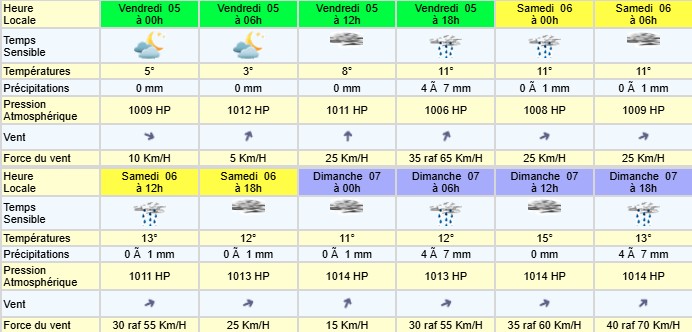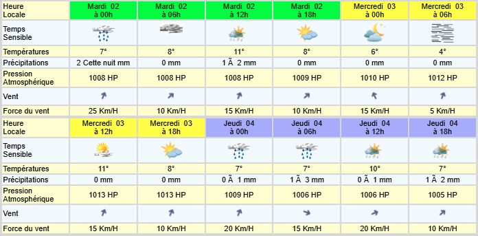Nuageux à averses éparses puis variable, 8°C/11°C. Demain, basses couches suivi d’éclaircies à ciel variable, 4°C/11°C. Jeudi, pluie suivi d’averses, 7°C/10°C. Vendredi, brumeux ciel variable puis voilé et pluvieux le soir, 3°C/11°C. Samedi, nuageux et venteux à voilé accompagné d’averses éparses, 11°C/13°C. Dimanche, pluvieux et venteux, 12°C/15°C. Lundi, bruine puis nuageux et variable, 12°C/15°C. Mardi, nuageux ciel variable, 10°C/15°C. Mercredi, d’éclaircie à variable, 8°C/13°C.